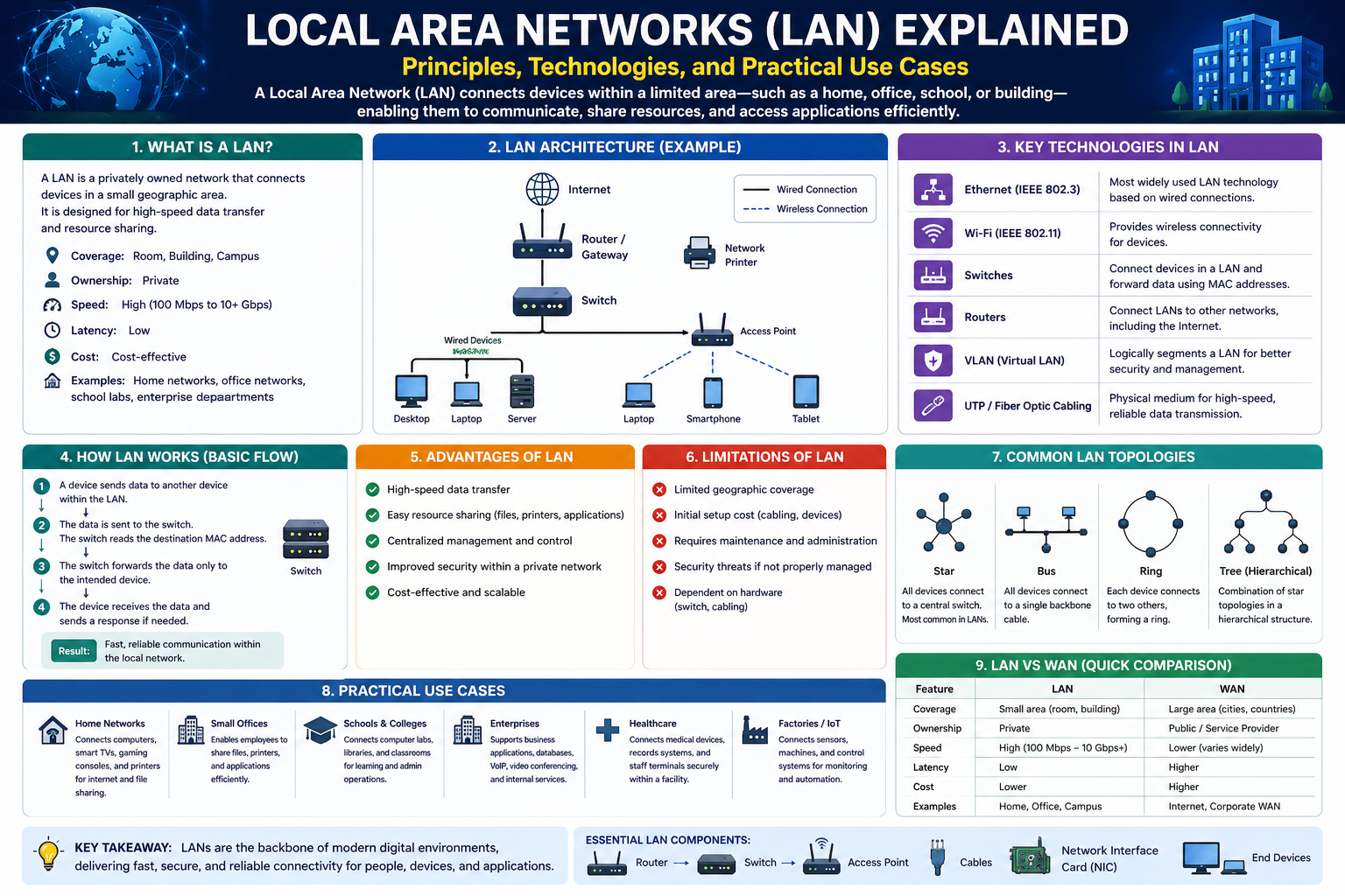 A Local Area Network is a fundamental component of modern computing, providing the infrastructure needed for communication, resource sharing, and collaboration. From small home networks to large organizational systems, LANs play a critical role in enabling efficient and secure data exchange.