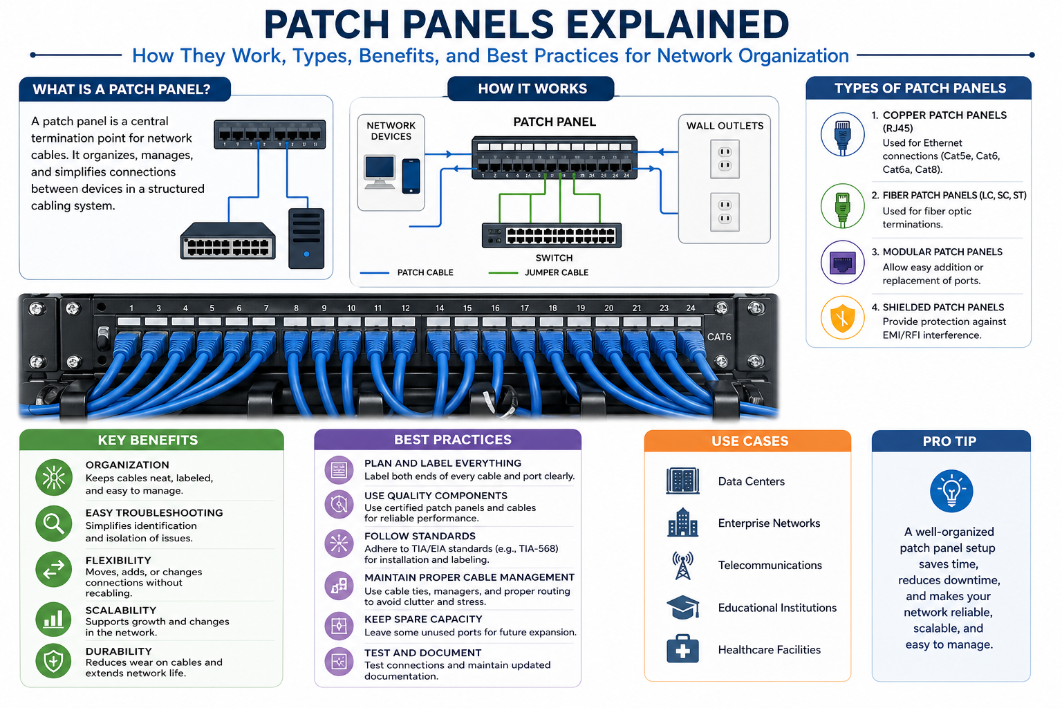 One of the primary reasons for using a patch panel is to maintain organization within a network. As networks grow, the number of cables increases significantly. Without a proper system, managing these cables becomes extremely difficult.