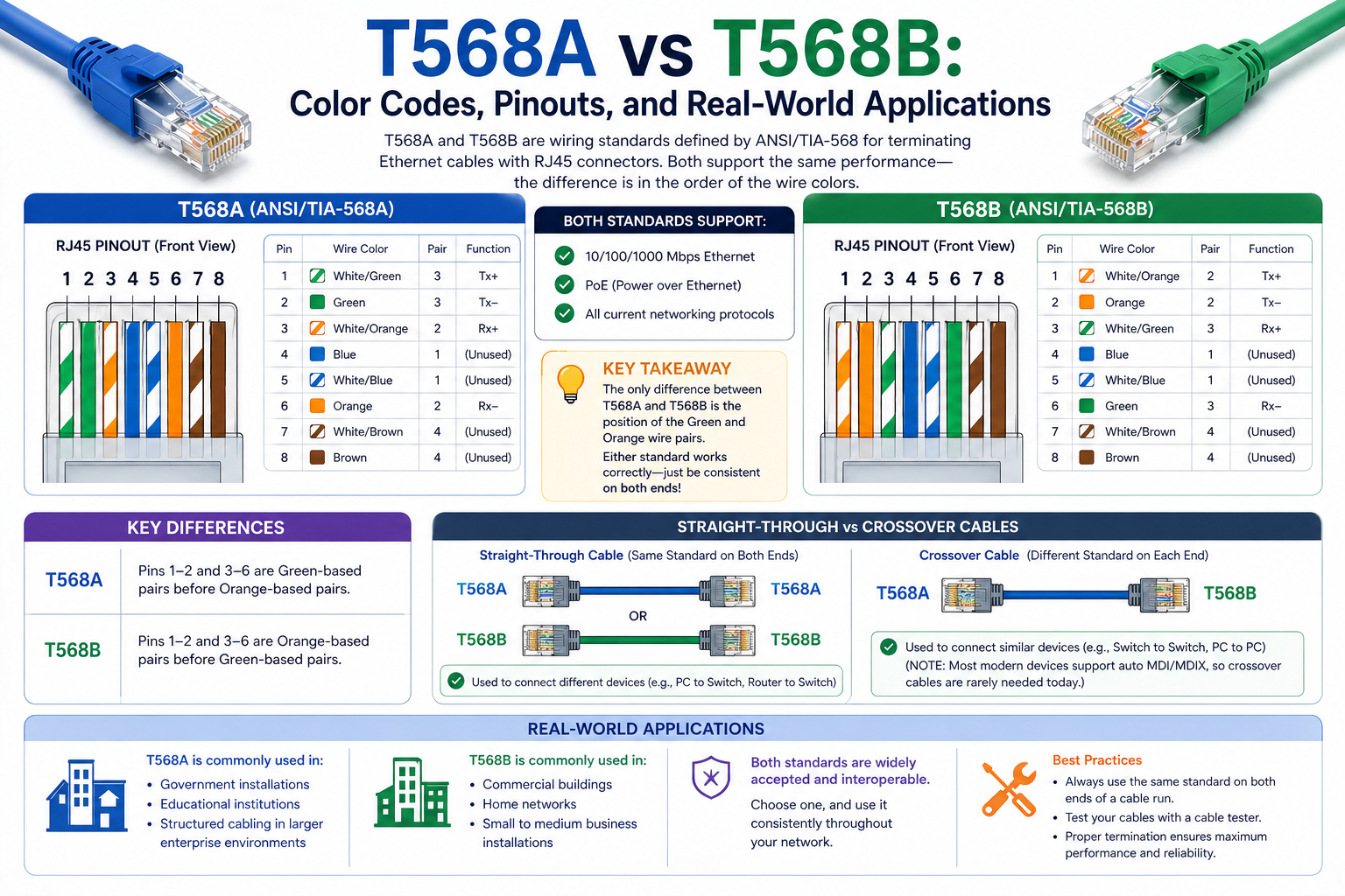 T568A is often associated with compatibility and structured environments, while T568B is commonly used in modern installations due to its widespread adoption. However, neither standard is technically superior to the other.